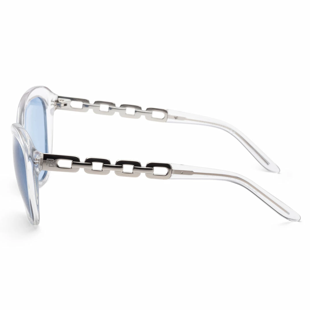 Dimensions – 56 mm x 17 mm x 140 mm. The frame is Acetate Cat-Eye shaped. The frame is Crystal and the lens is Light Blue.