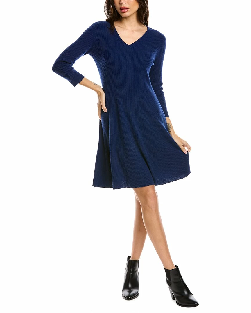 - A-Line Cashmere Sweaterdress In Navy With Ribbed Knit Design, V-Neck, And 3/4-Length Sleeves