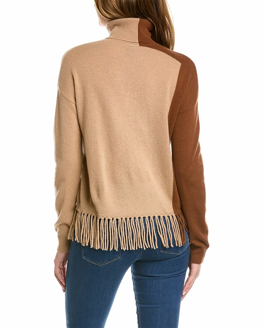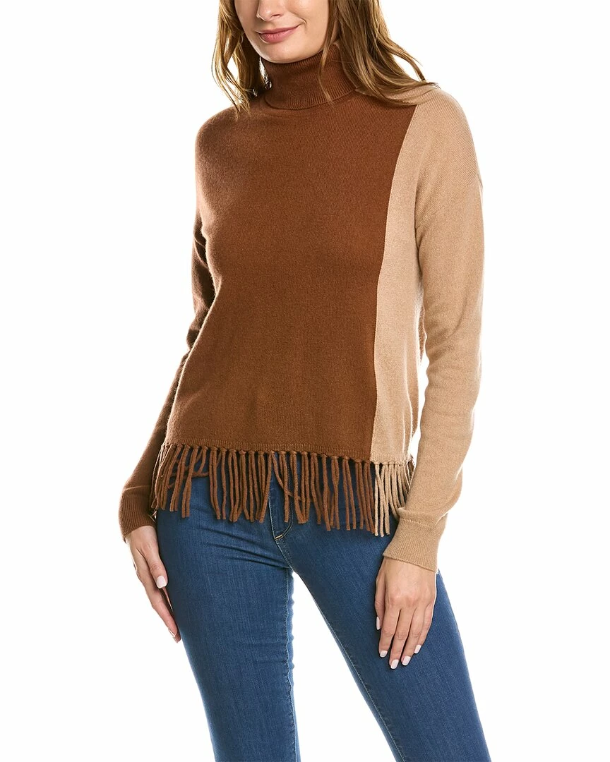 - Colorblock Cashmere Sweater In Brown With Turtleneck, Dropped-Shoulder Sleeves, And Fringe At Hem
