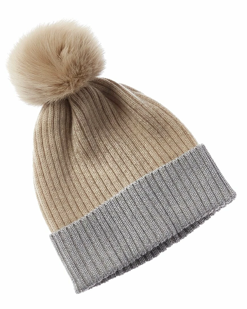 - Contrast Trim Cashmere-Trim Hat In Oatmeal/Grey With Metallic Cuff And Fur Pom