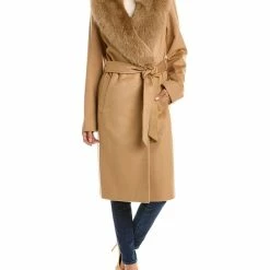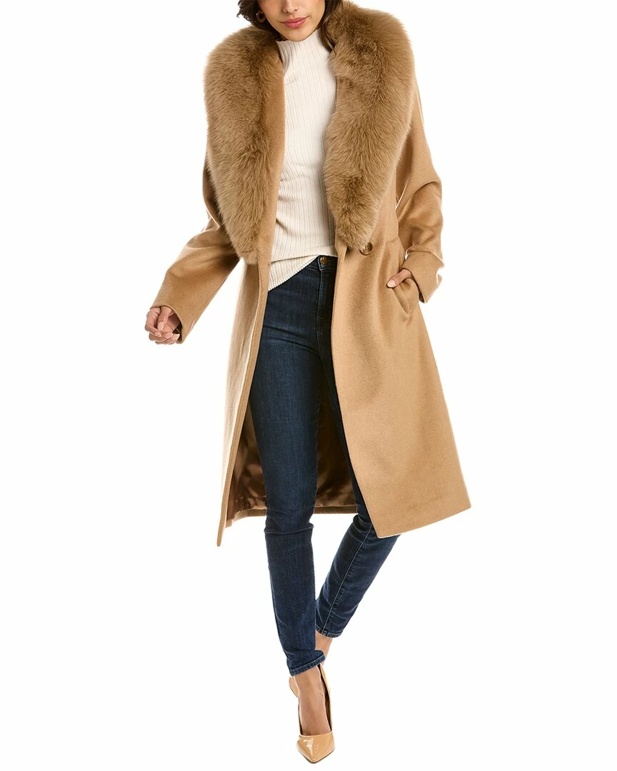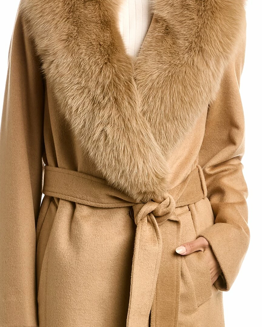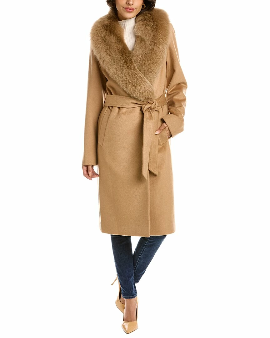 - Oversized Collar Wool-Blend Coat In Camel With Fur Shawl Collar, Two Front Pockets, Tie Belt At Waist, And Center Vent At Back Hem