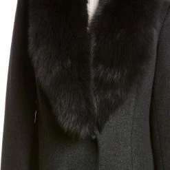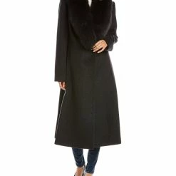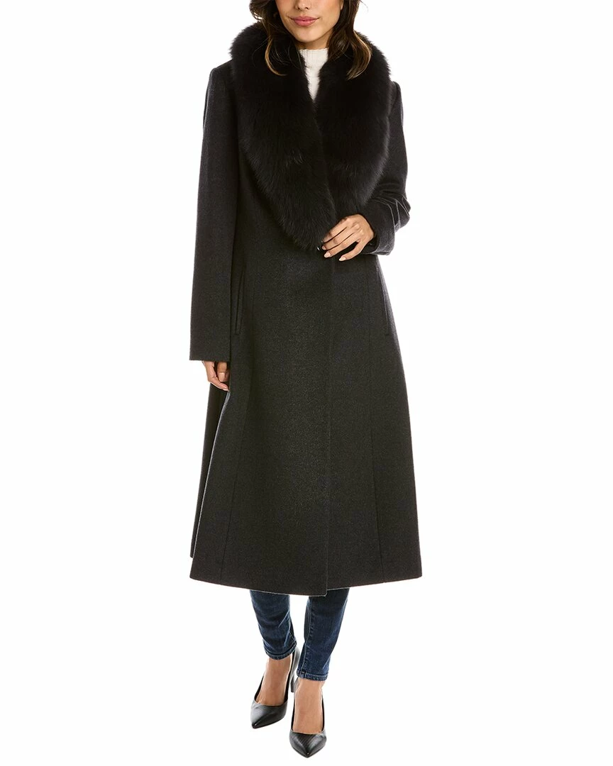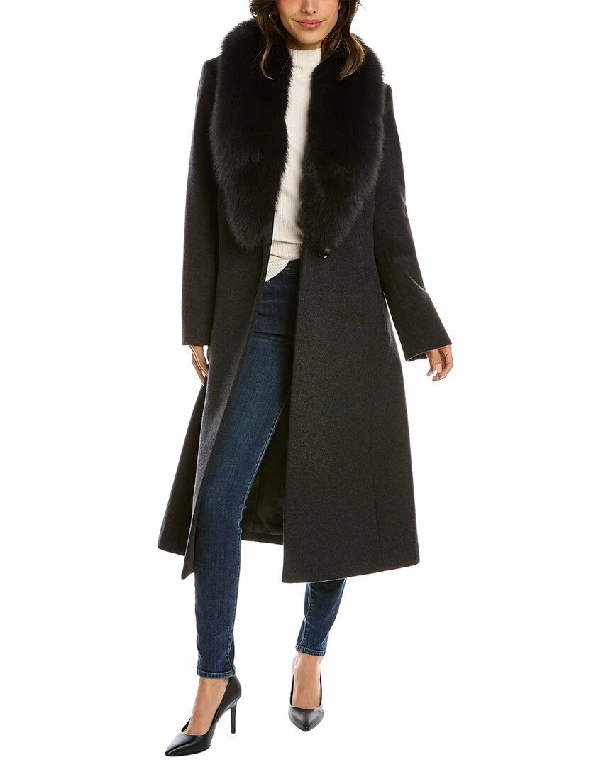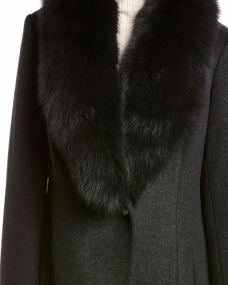 - Oversized Collar Wool-Blend Coat In Charcoal With Fur Shawl Collar, Two Front Pockets, Tie Belt At Waist, And Center Vent At Back Hem