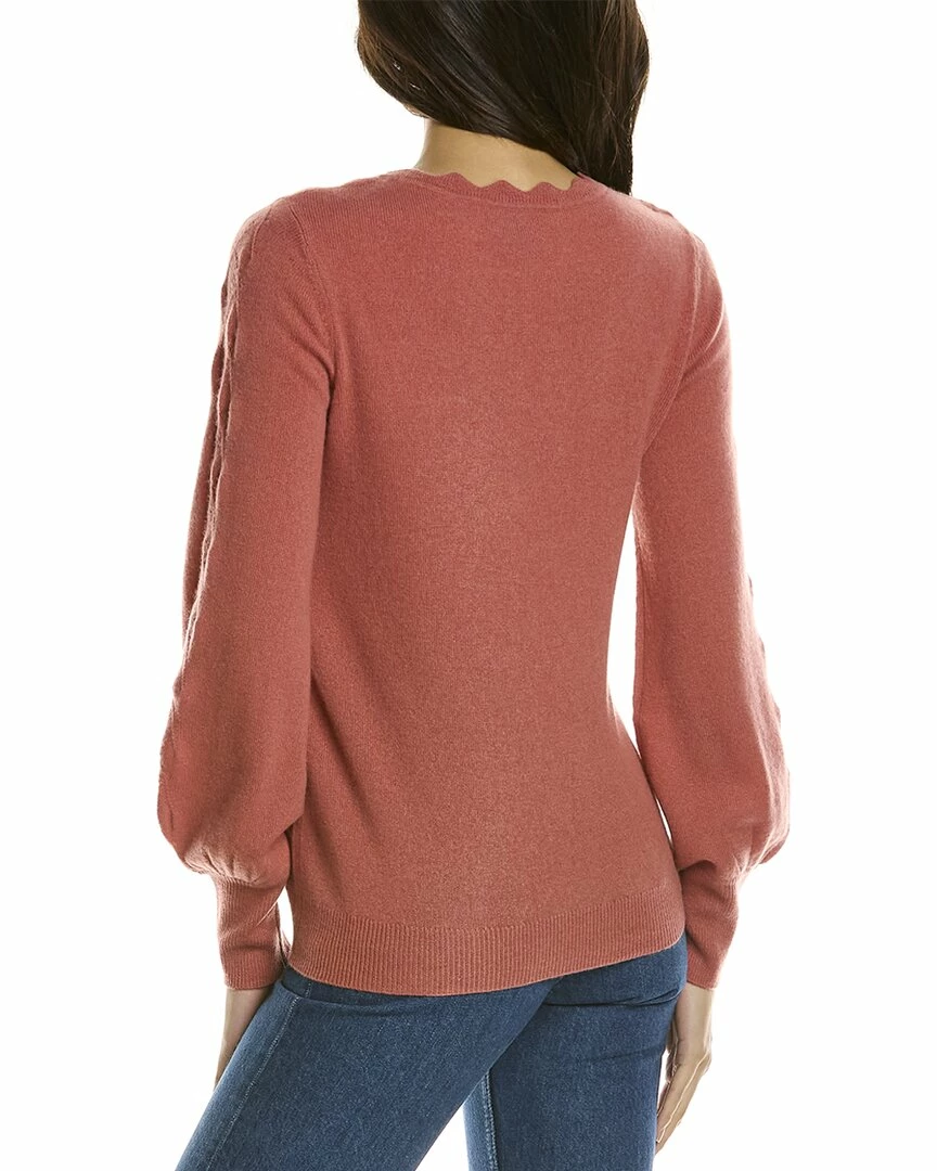 - Pointelle Cashmere Sweater In Pink With Balloon Sleeves And Scallop Neckline