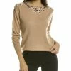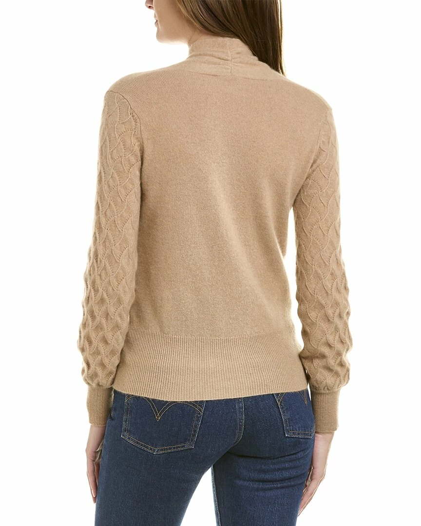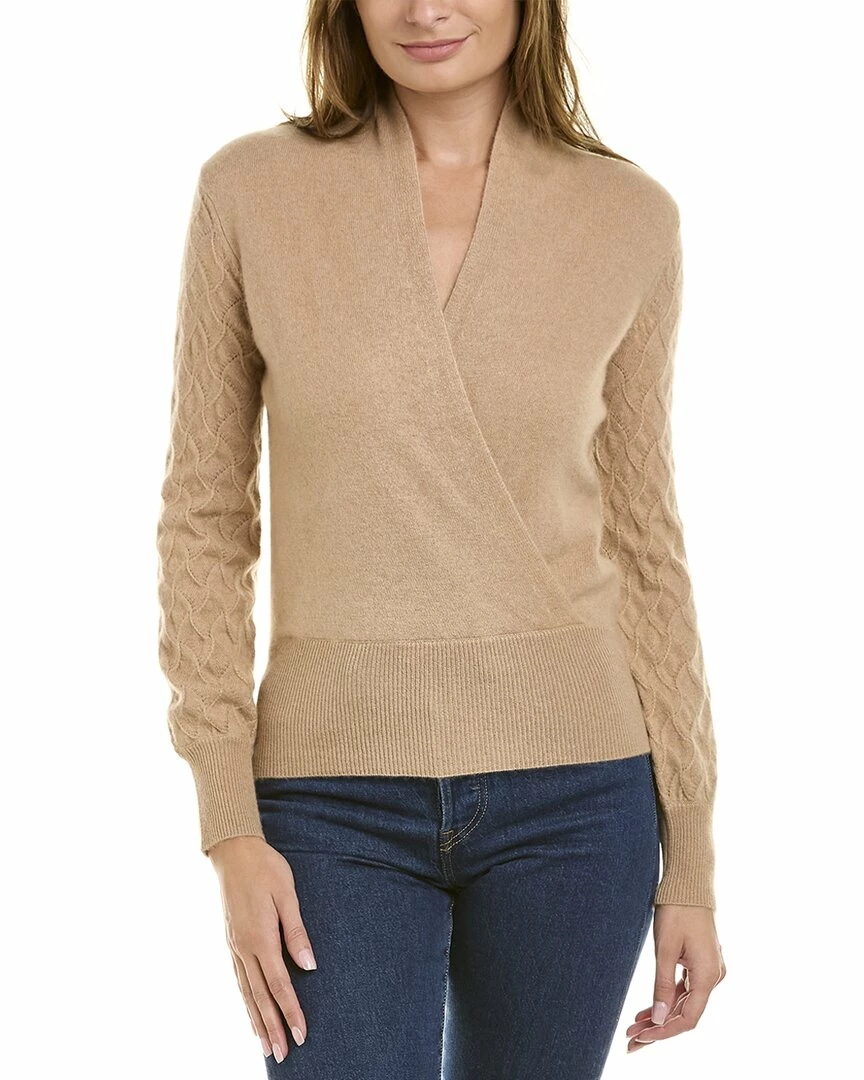 - Pointelle Wrap Cashmere Sweater In Tan With Surplice Front, Pointelle Knit Sleeves And Ribbed Trim