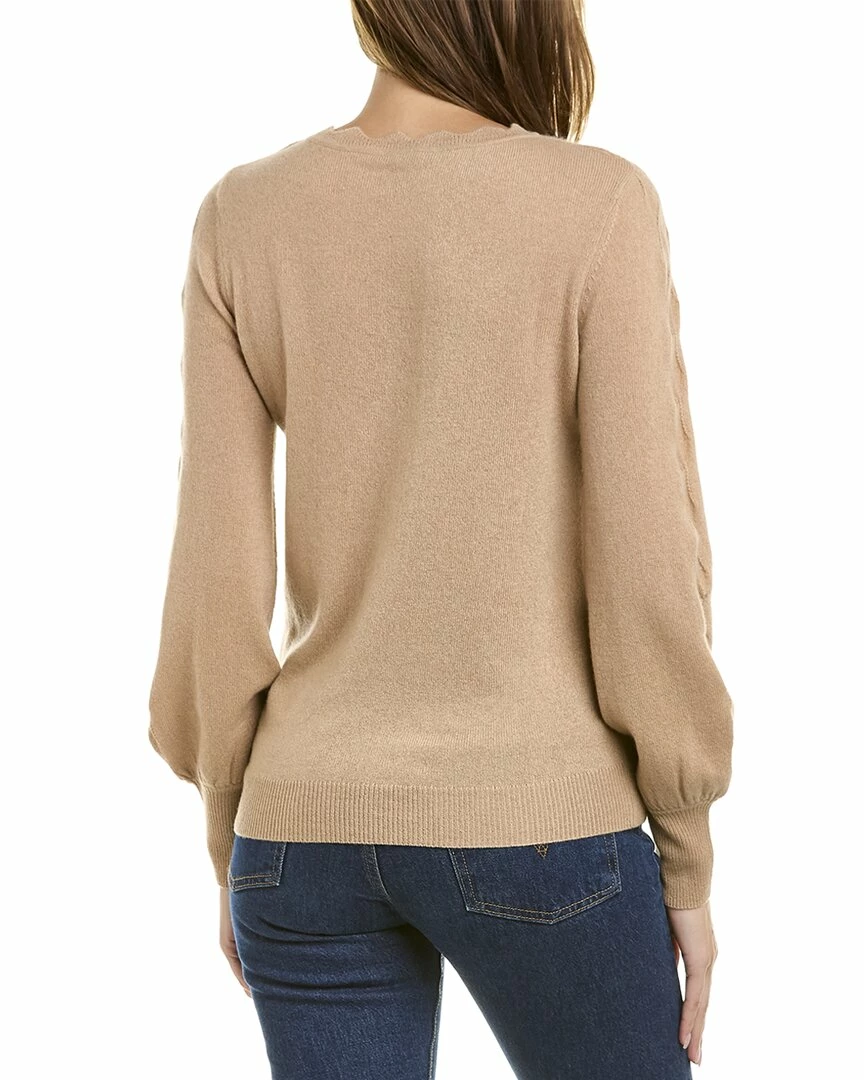 - Pointelle Yoke Cashmere Sweater In Tan With Scalloped Boat Neck, Pointelle Knit Yoke And Ribbed Trim