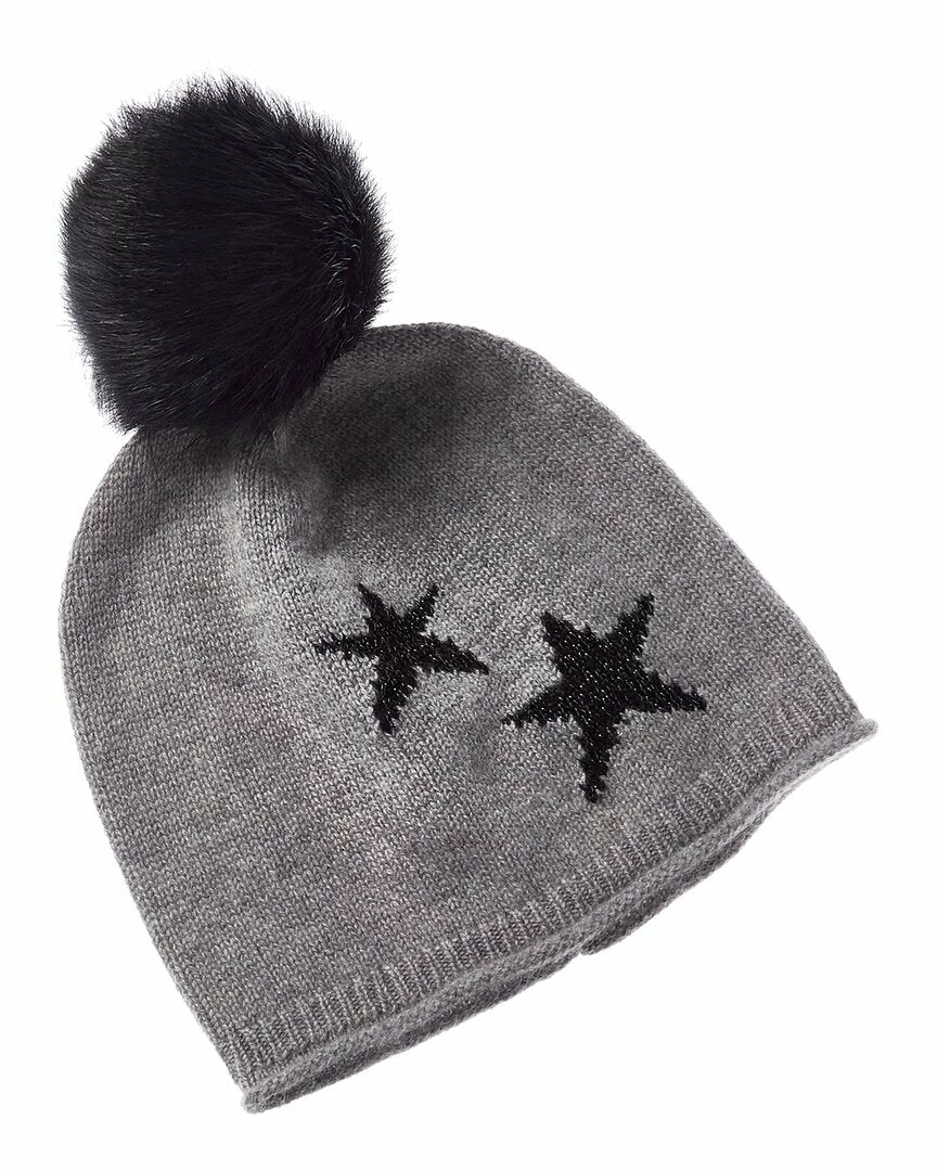 - Hat In Grey With Metallic Threading, Furled Hem And Fur Pom