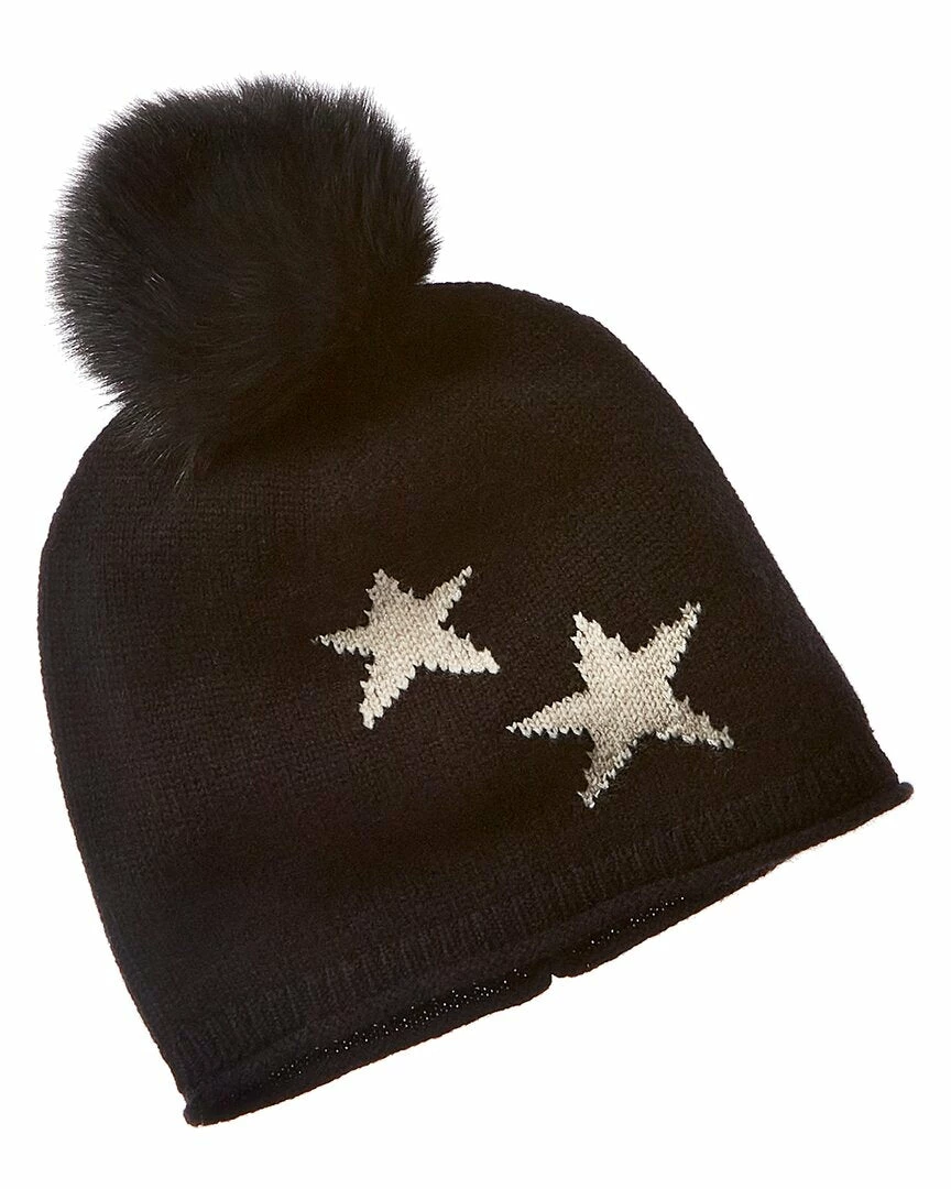 - Star Cashmere-Blend Hat In Black/White With Metallic Threading, Furled Hem And Fur Pom