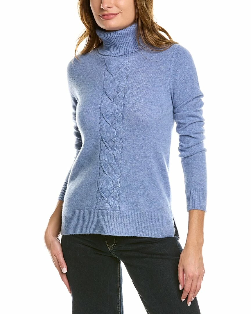 - Turtleneck Cashmere Sweater In Blue With Center Cable Knit Detail And Ribbed Trim