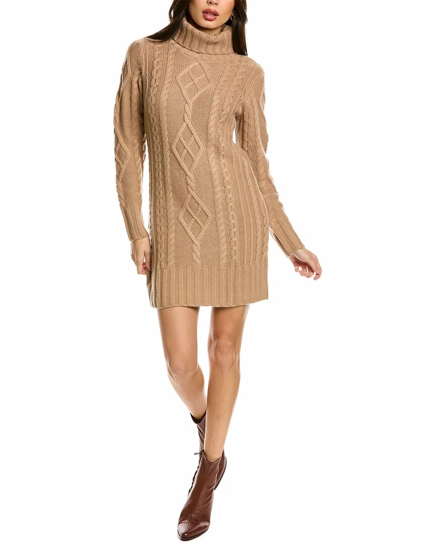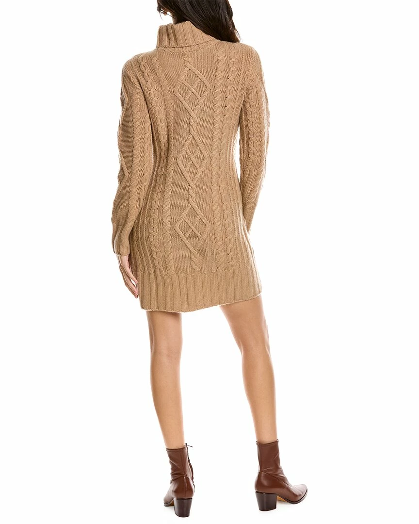 - Wool & Cashmere-Blend Tunic Dress In Tan With Cable-Knit Design And Turtleneck